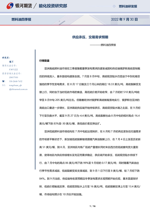 【银河期货】【20220930】燃料油四季报:供应承压,交易需求预期-16页