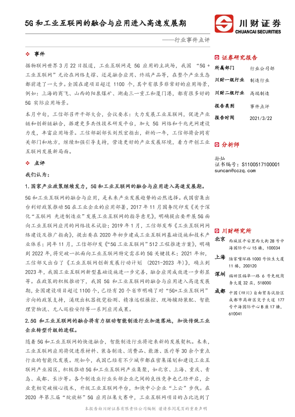 【川财证券】【20210322】制造行业事件点评:5G和工业互联网的融合与应用进入高速发展期-3页