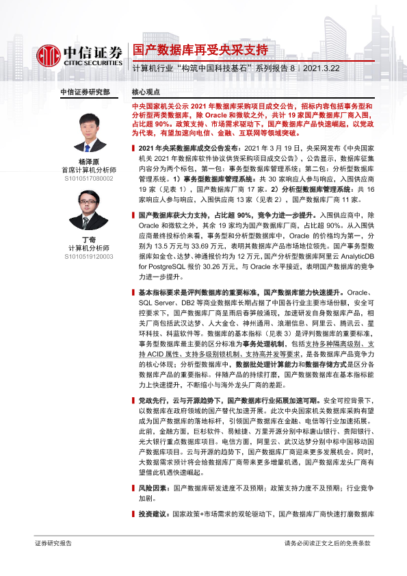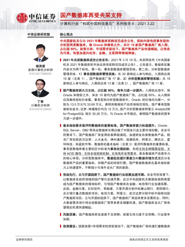 【中信证券】【20210322】计算机行业“构筑中国科技基石”系列报告8:国产数据库再受央采支持-4页