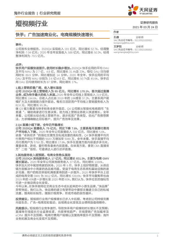 【天风证券】【20210324】短视频行业:快手:广告加速商业化,电商规模快速增长-2页