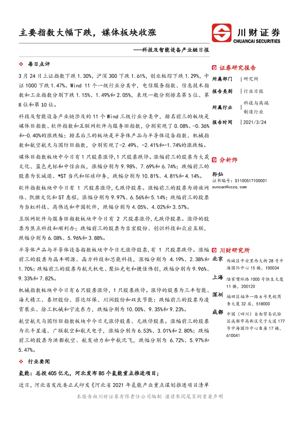 【川财证券】【20210324】科技及智能设备产业链日报:主要指数大幅下跌,媒体板块收涨-3页