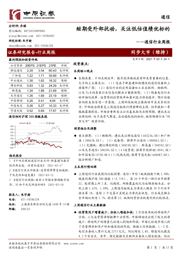 【中原证券】【20210324】20210324-中原证券-通信行业周报:短期受外部扰动,关注低估值绩优标的-15页