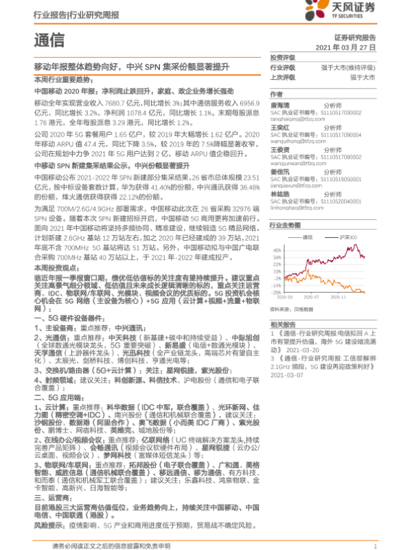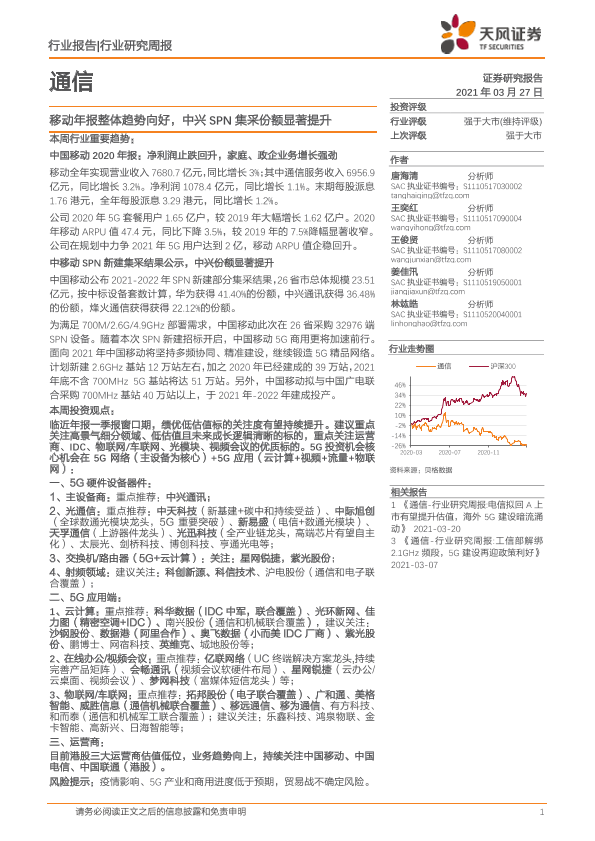 【天风证券】【20210327】通信行业研究周报:移动年报整体趋势向好,中兴SPN集采份额显著提升-12页