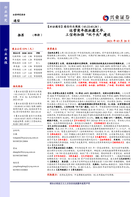 【兴业证券】【20210328】【兴证通信】通信行业周报(03.22-03.28):运营商年报批露完毕, 工信部加强“双千兆”建设-15页
