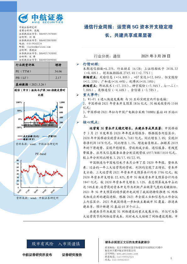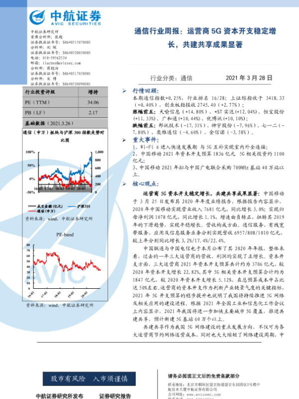 【中航证券】【20210328】通信行业周报:运营商5G资本开支稳定增长,共建共享成果显著-4页