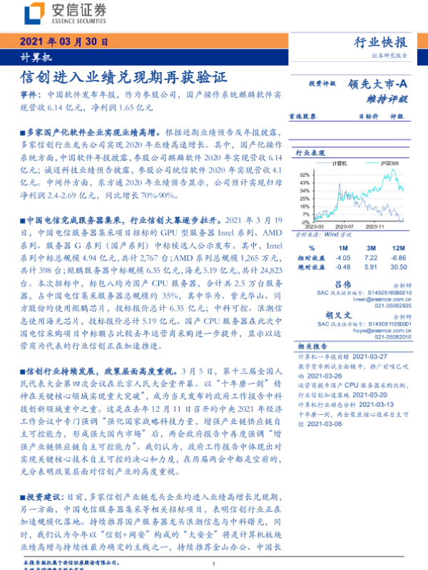 【安信证券】【20210330】计算机行业:信创进入业绩兑现期再获验证-4页