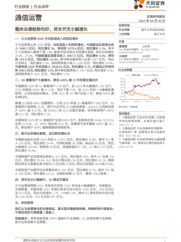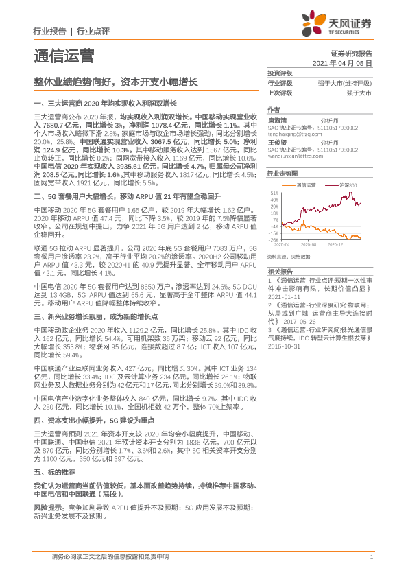 【天风证券】【20210405】通信运营:整体业绩趋势向好,资本开支小幅增长-13页