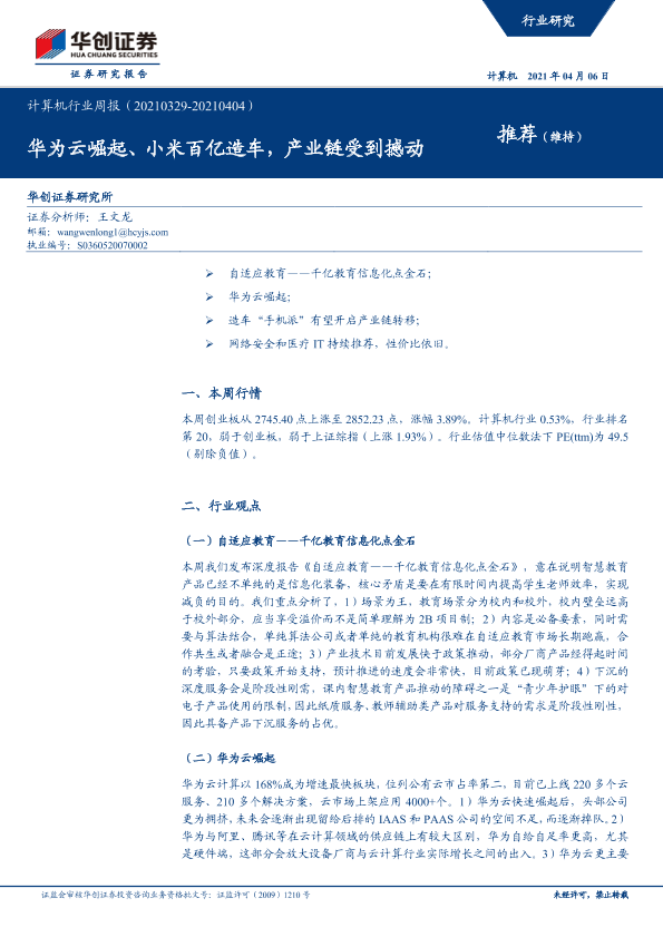 【华创证券】【20210406】20210406-华创证券-计算机行业周报:华为云崛起、小米百亿造车,产业链受到撼动-5页