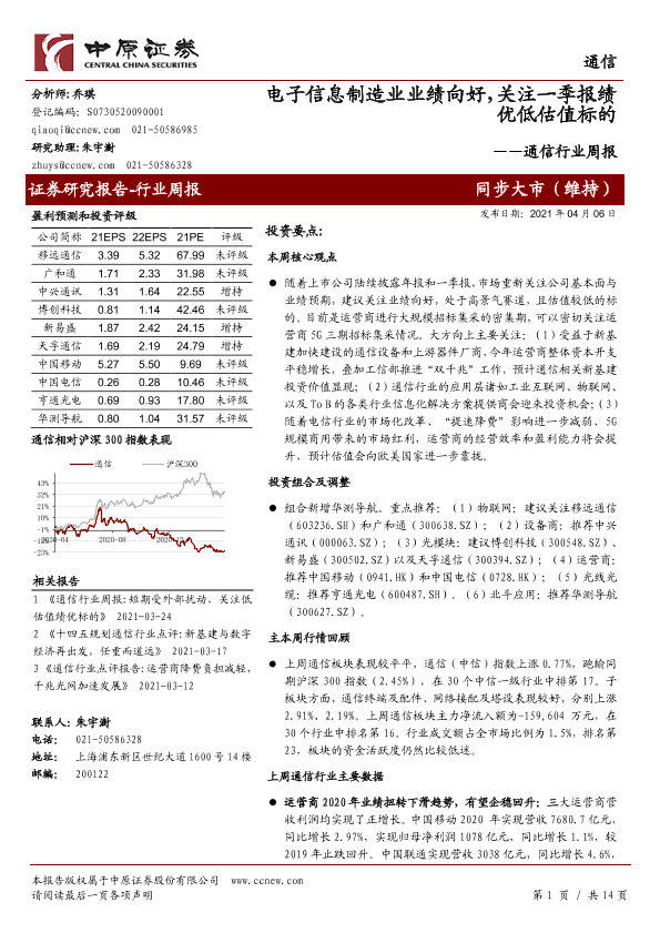 【中原证券】【20210406】通信行业周报:电子信息制造业业绩向好,关注一季报绩优低估值标的-14页