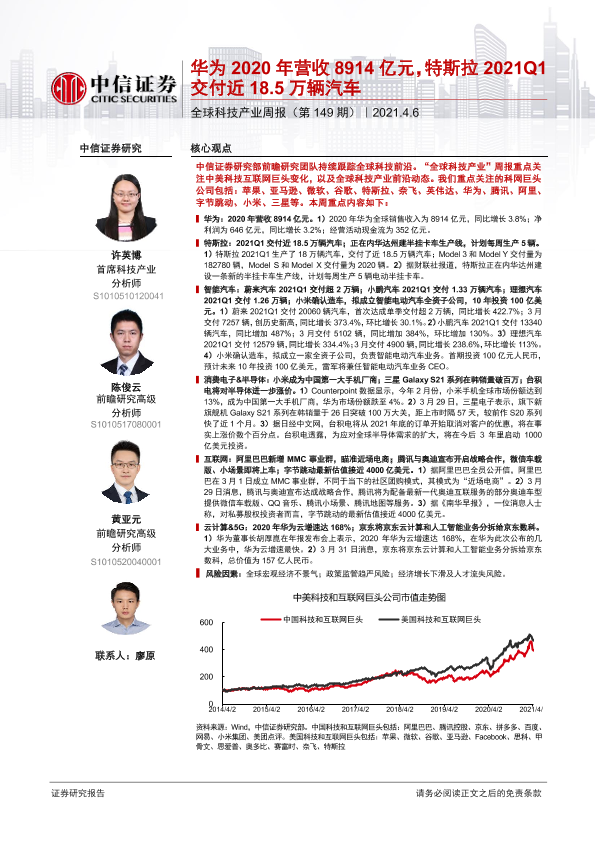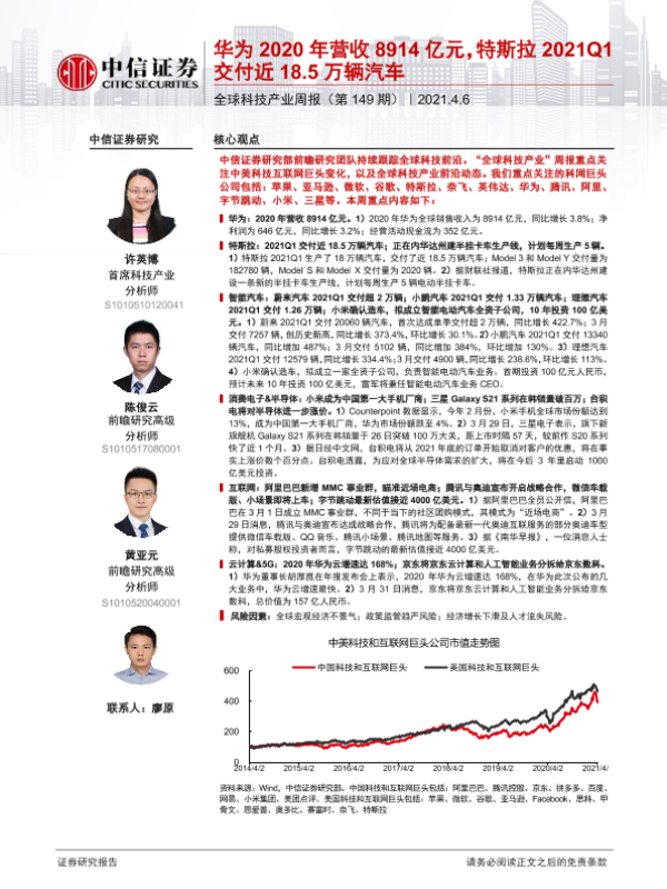【中信证券】【20210406】全球科技产业周报(第149期):华为2020年营收8914亿元,特斯拉2021Q1交付近18.5万辆汽车-16页