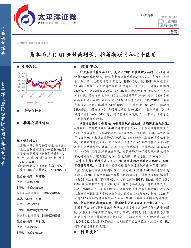【太平洋证券】【20210410】20210410-太平洋-通信行业周报:基本面上行Q1业绩高增长,推荐物联网和北斗应用-13页