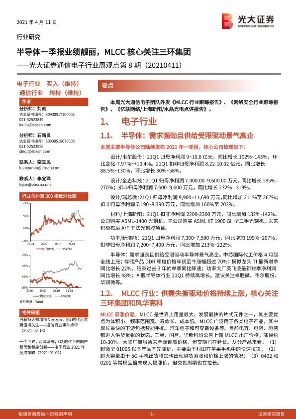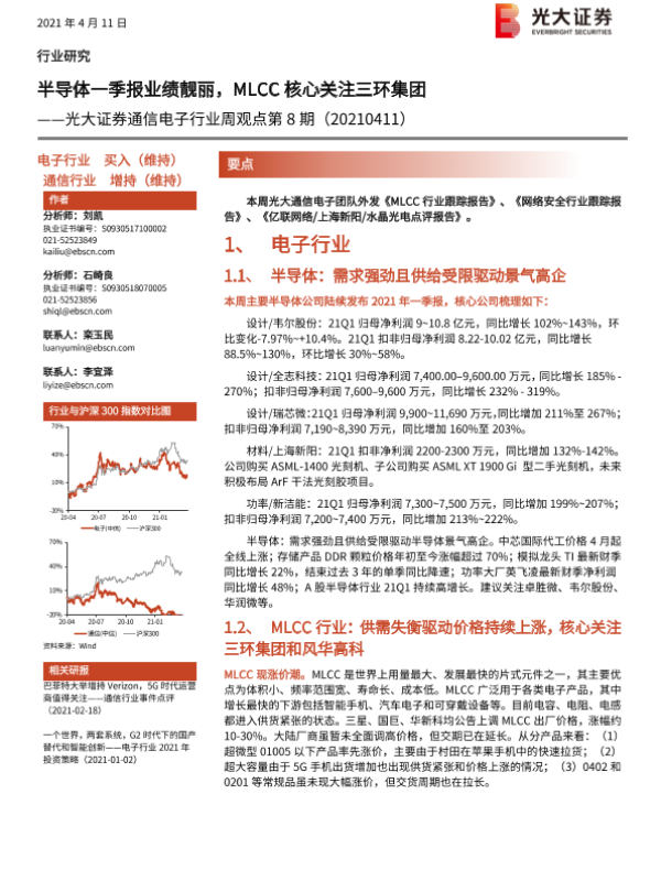 【光大证券】【20210411】20210411-光大证券-通信电子行业周观点第8期:半导体一季报业绩靓丽,MLCC核心关注三环集团-9页