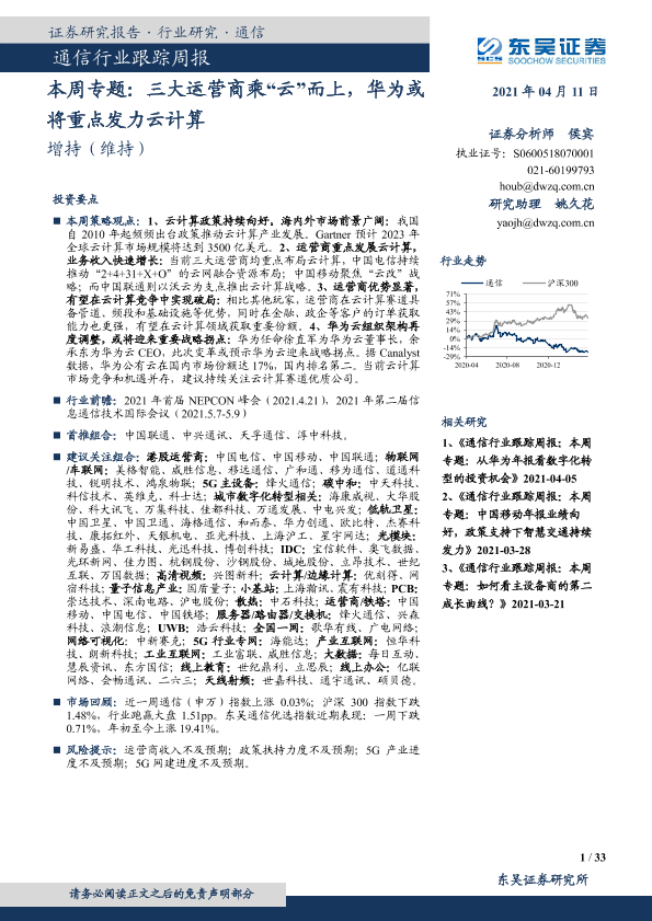 【东吴证券】【20210411】通信行业本周专题:三大运营商乘“云”而上,华为或将重点发力云计算-33页