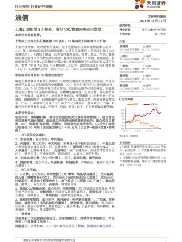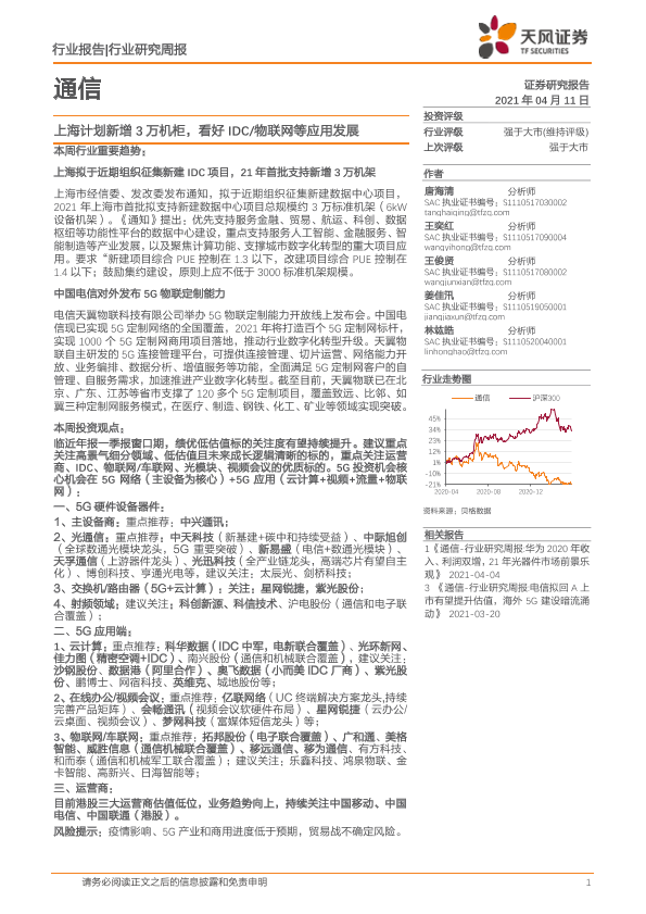 【天风证券】【20210411】20210411-天风证券-通信行业研究周报:上海计划新增3万机柜,看好IDC 物联网等应用发展-14页