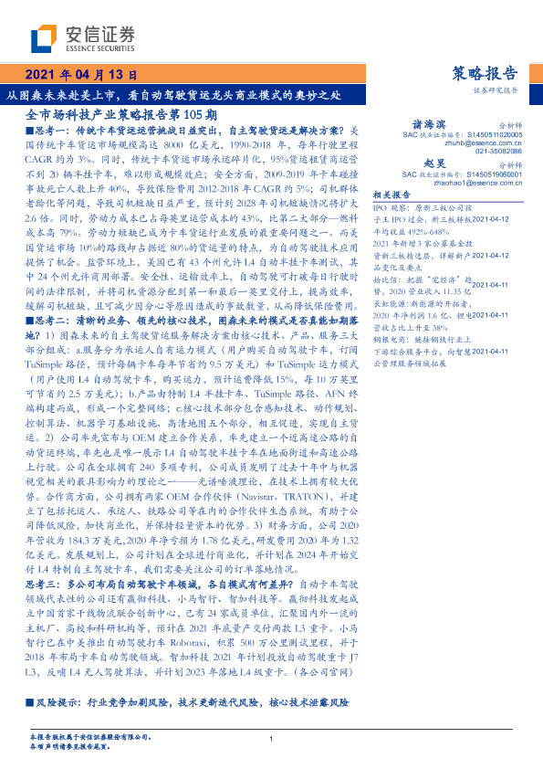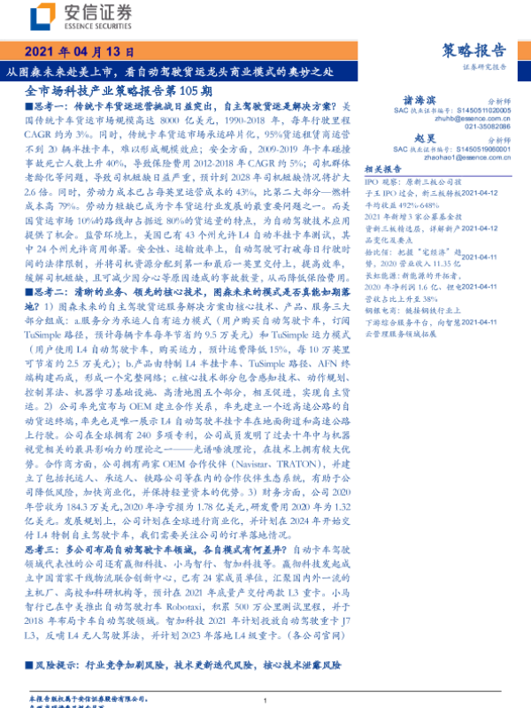 【安信证券】【20210413】从图森未来赴美上市,看自动驾驶货运龙头商业模式的奥妙之处-33页