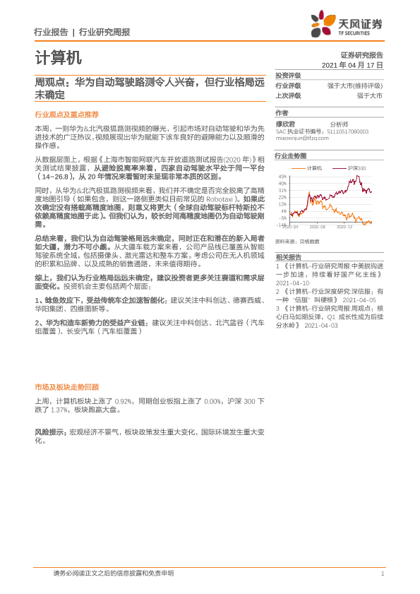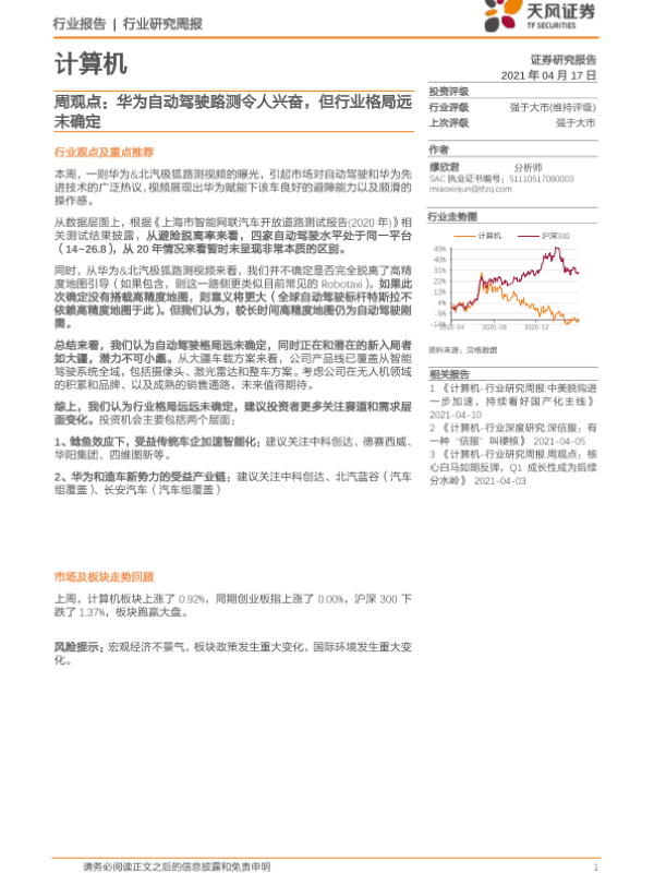【天风证券】【20210417】计算机行业周观点:华为自动驾驶路测令人兴奋,但行业格局远未确定-8页