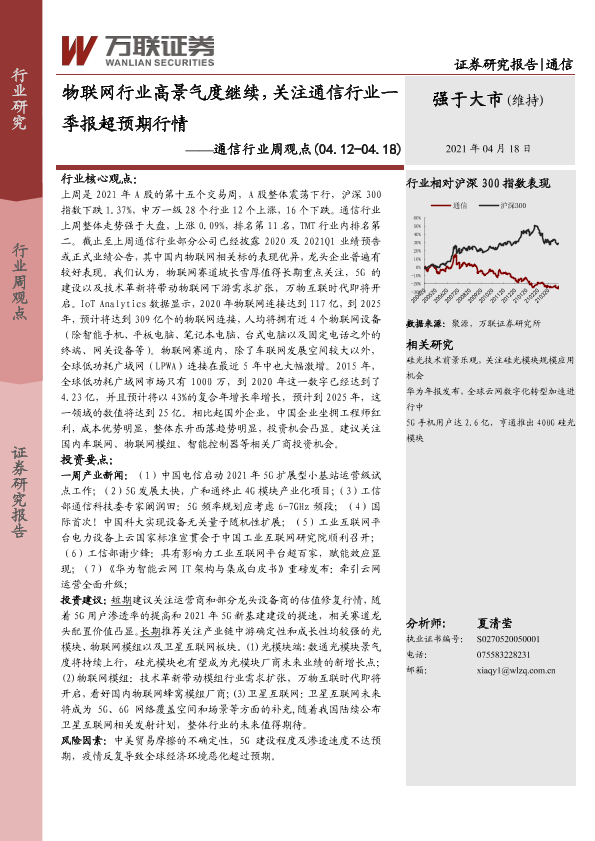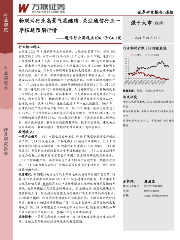 【万联证券】【20210418】通信行业周观点:物联网行业高景气度继续,关注通信行业一季报超预期行情-18页