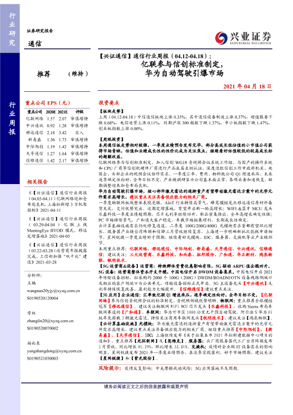 【兴业证券】【20210418】【兴证通信】通信行业周报(04.12-04.18):亿联参与信创标准制定, 华为自动驾驶引爆市场-17页