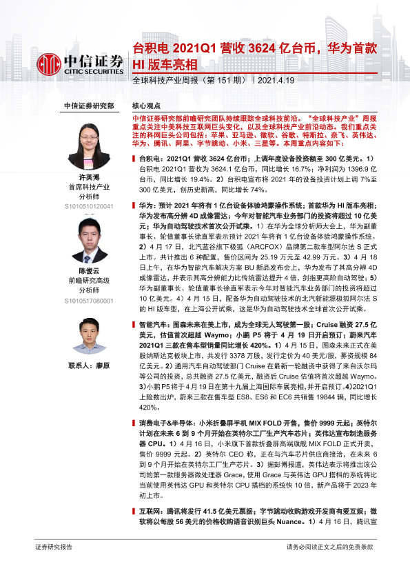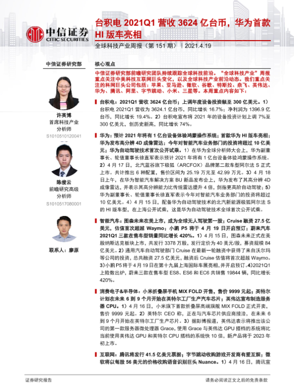 【中信证券】【20210419】全球科技产业周报(第151期):台积电2021Q1营收3624亿台币,华为首款HI版车亮相-15页