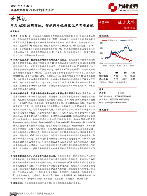 【万和证券】【20210420】计算机:华为ADS应用落地,智能汽车规模化生产有望提速-6页