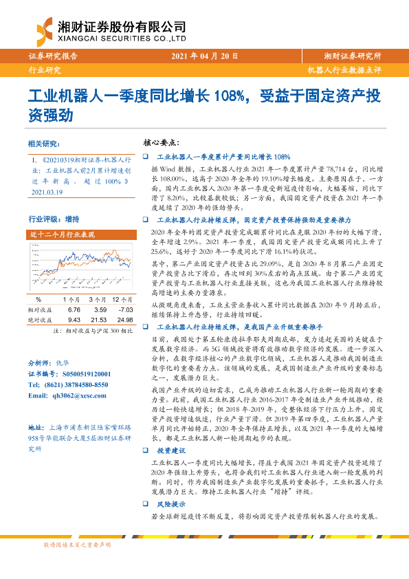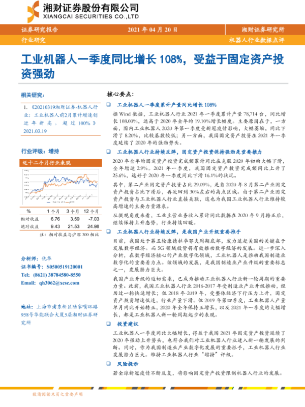 【湘财证券】【20210420】机器人行业数据点评:工业机器人一季度同比增长108%,受益于固定资产投资强劲-4页