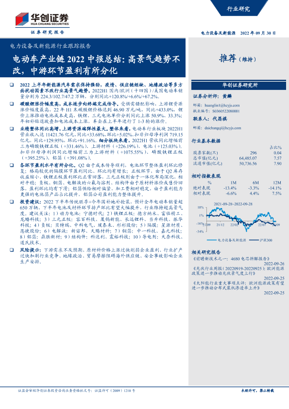 【华创证券】【20220930】电力设备及新能源行业跟踪报告:电动车产业链2022中报总结,高景气趋势不改,中游环节盈利有所分化-20页
