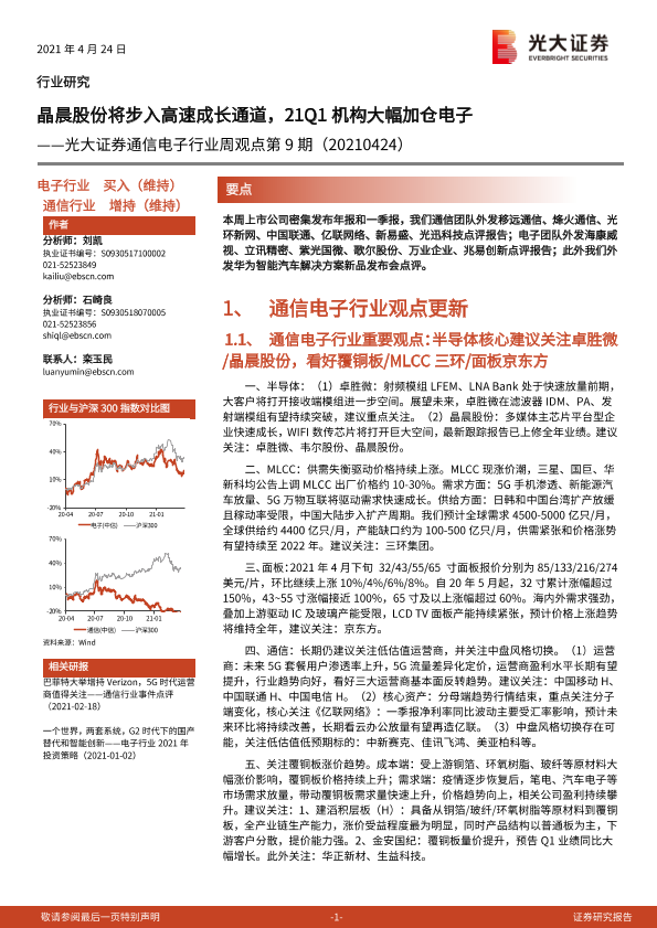 【光大证券】【20210424】20210424-光大证券-通信电子行业周观点第9期:晶晨股份将步入高速成长通道,21Q1机构大幅加仓电子-10页