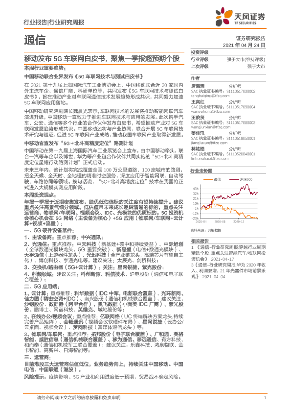 【天风证券】【20210424】20210424-天风证券-通信行业研究周报:移动发布5G车联网白皮书,聚焦一季报超预期个股-13页