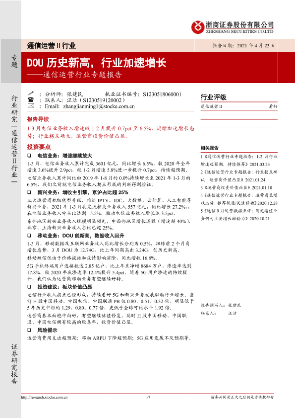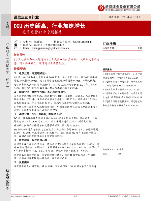 【浙商证券】【20210423】通信运营行业专题报告:DOU历史新高,行业加速增长-7页