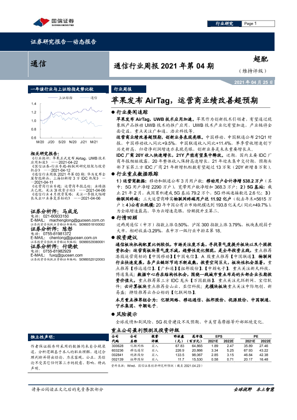 【国信证券】【20210425】通信行业周报2021年第04期:苹果发布AirTag,运营商业绩改善超预期-16页