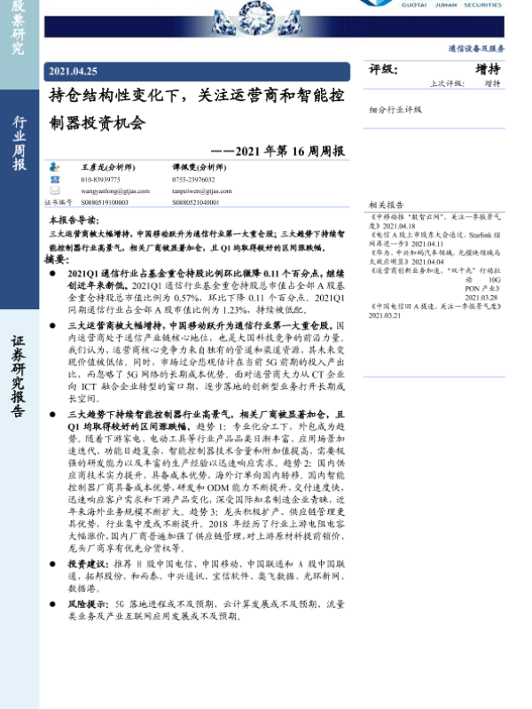 【国泰君安证券】【20210425】持仓结构性变化下,关注运营商和智能控制器投资机会——2021年第16周周报-25页