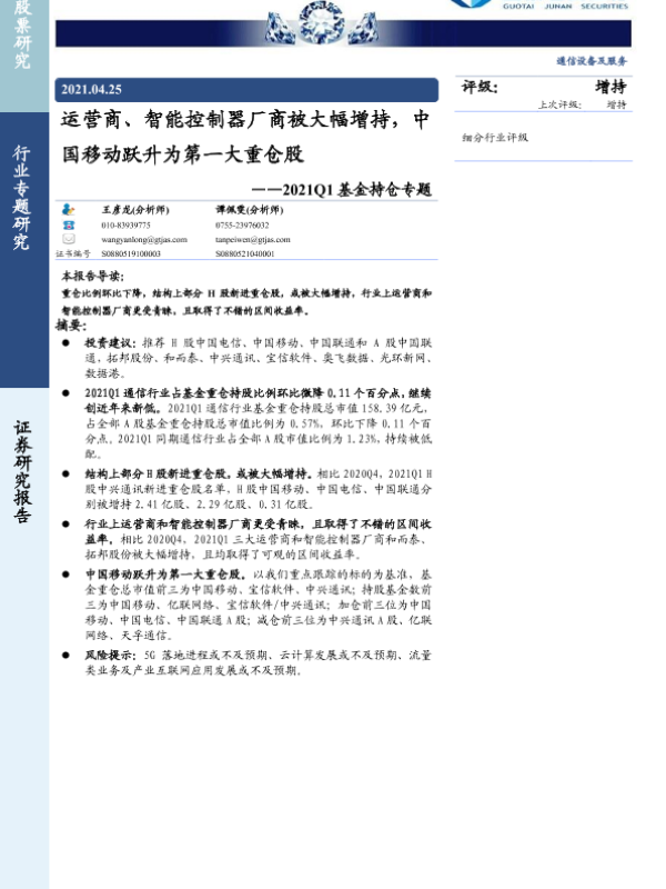 【国泰君安证券】【20210425】2021Q1基金持仓专题:运营商、智能控制器厂商被大幅增持,中国移动跃升为第一大重仓股-5页