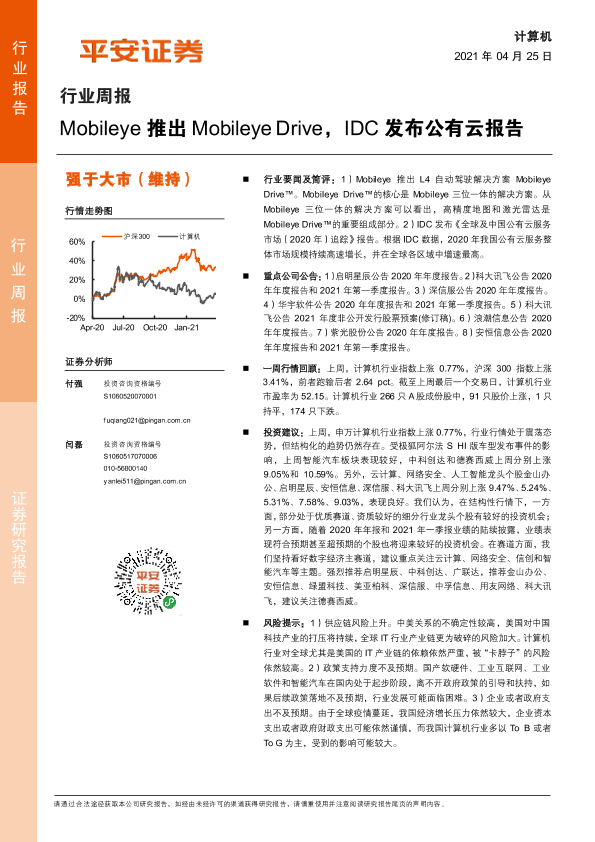 【平安证券】【20210425】计算机行业周报:Mobileye推出Mobileye Drive,IDC发布公有云报告-6页