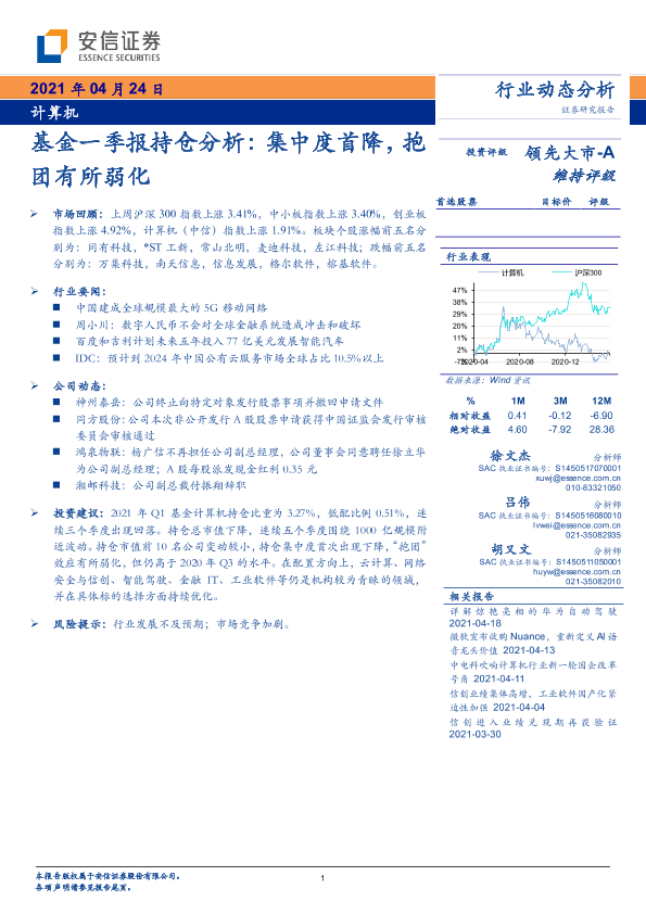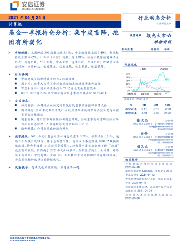 【安信证券】【20210424】计算机行业:基金一季报持仓分析:集中度首降,抱团有所弱化-39页