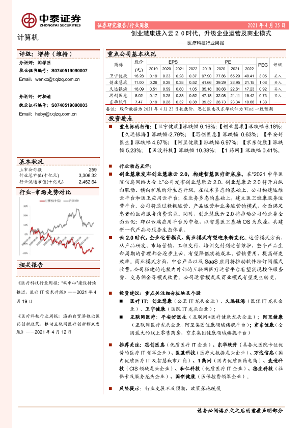 【中泰证券】【20210425】20210425-中泰证券-医疗科技行业周报:创业慧康进入云2.0时代,升级企业运营及商业模式-13页