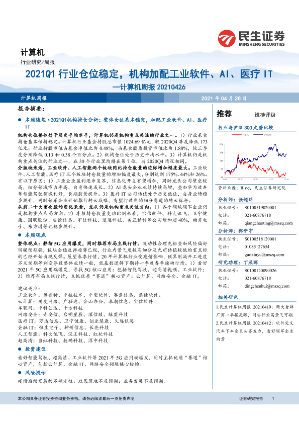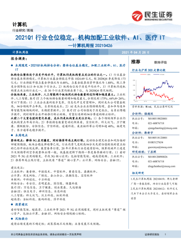 【民生证券】【20210426】20210426-民生证券-计算机周报:2021Q1行业仓位稳定,机构加配工业软件、AI、医疗IT-18页