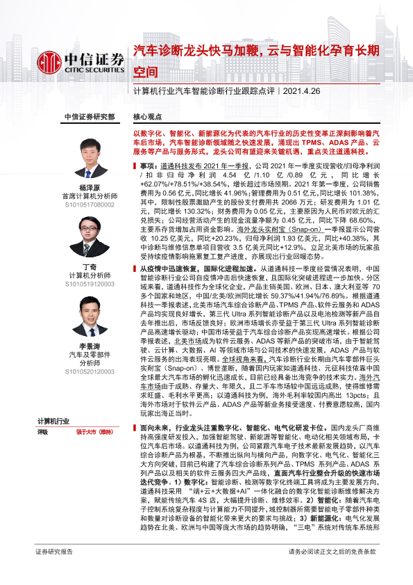 【中信证券】【20210426】计算机行业汽车智能诊断行业跟踪点评:汽车诊断龙头快马加鞭,云与智能化孕育长期空间-3页