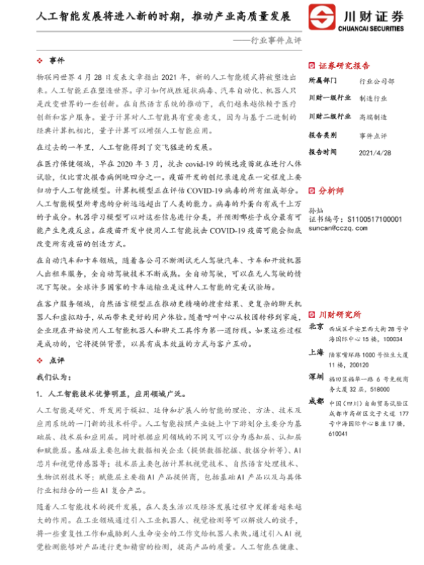 【川财证券】【20210428】高端制造行业事件点评:人工智能发展将进入新的时期,推动产业高质量发展-3页
