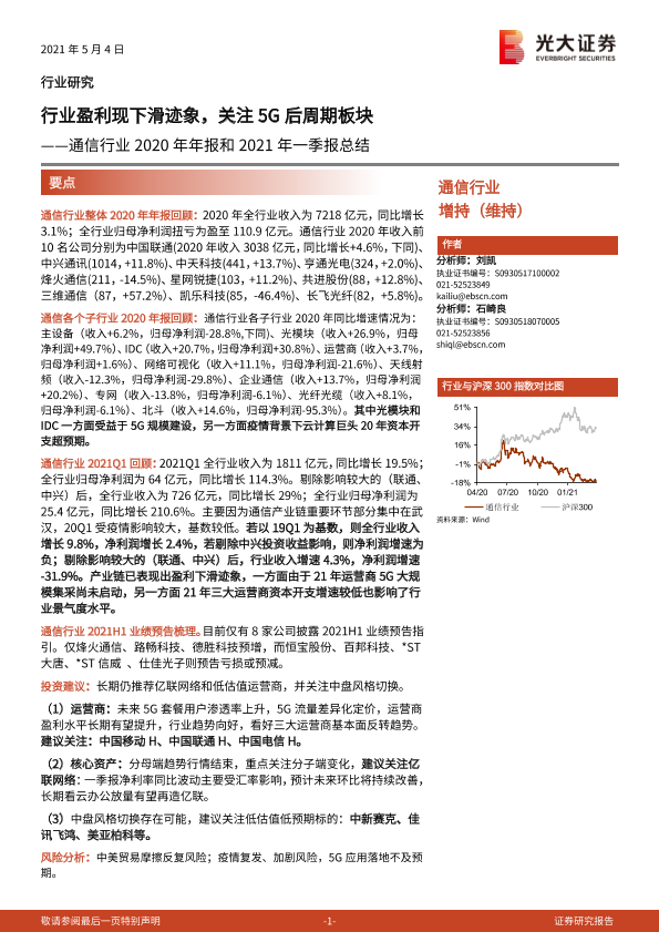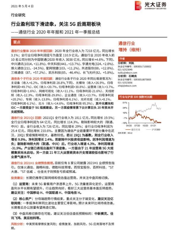 【光大证券】【20210504】通信行业2020年年报和2021年一季报总结:行业盈利现下滑迹象,关注5G后周期板块-13页