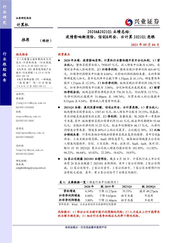 【兴业证券】【20210504】2020A&2021Q1业绩总结:疫情影响渐消除,信创&网安、云计算2021Q1亮眼-15页