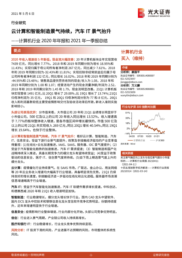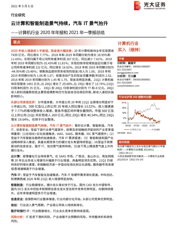 【光大证券】【20210506】计算机行业2020年年报和2021年一季报总结:云计算和智能制造景气持续,汽车IT景气抬升-13页