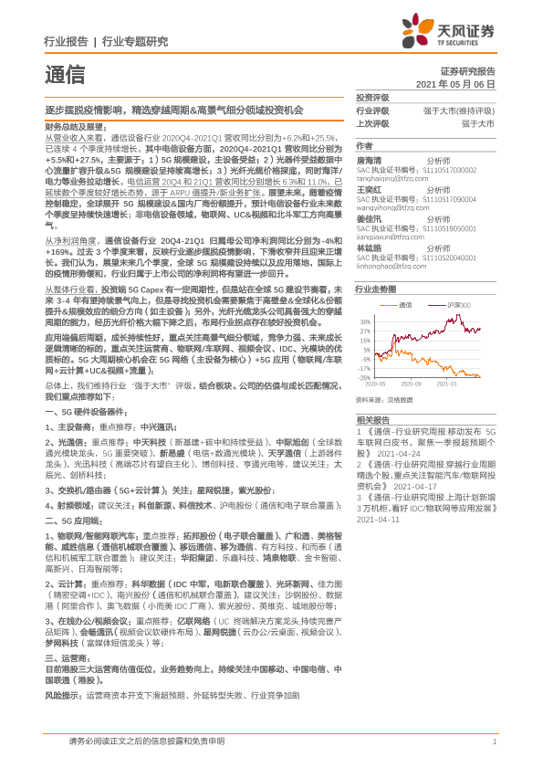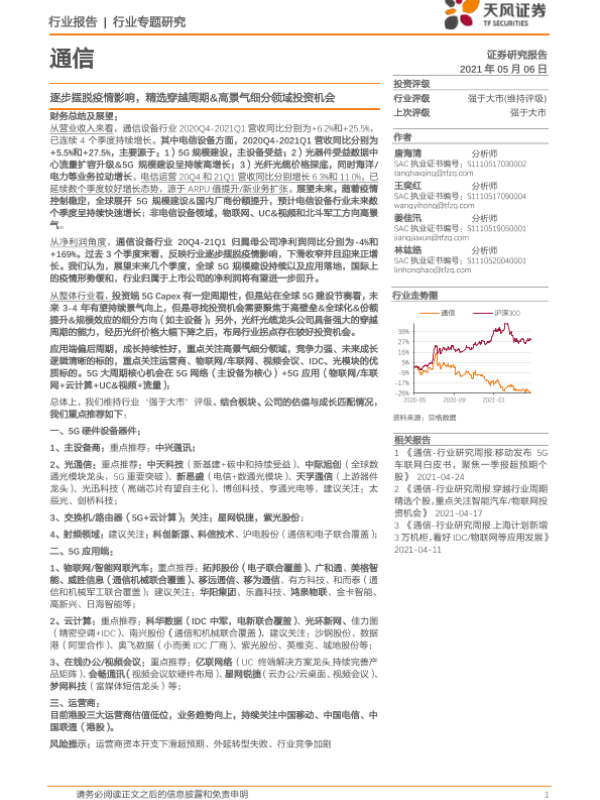 【天风证券】【20210506】通信行业专题研究:逐步摆脱疫情影响,精选穿越周期&高景气细分领域投资机会-29页