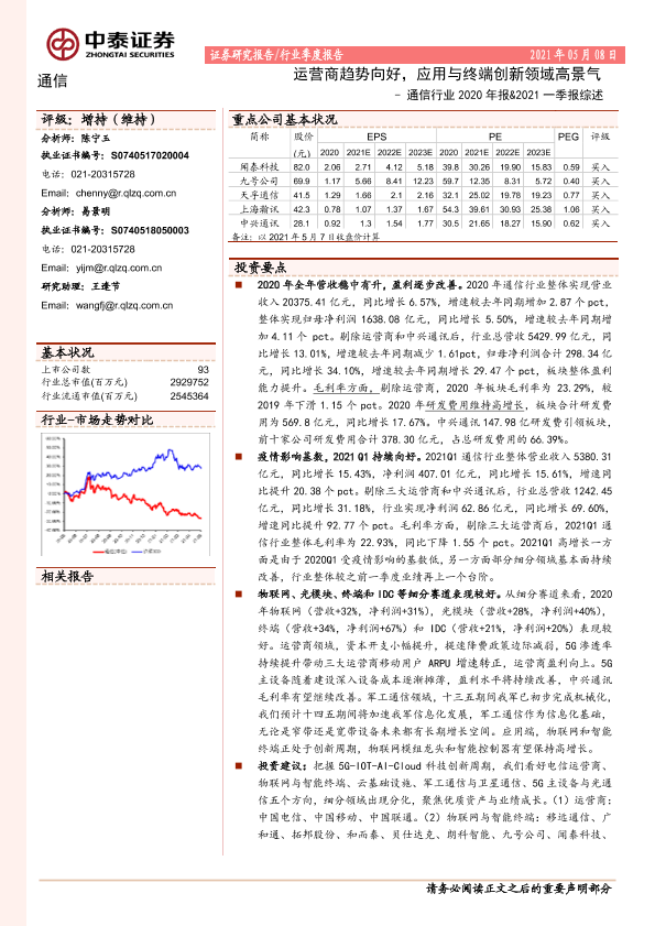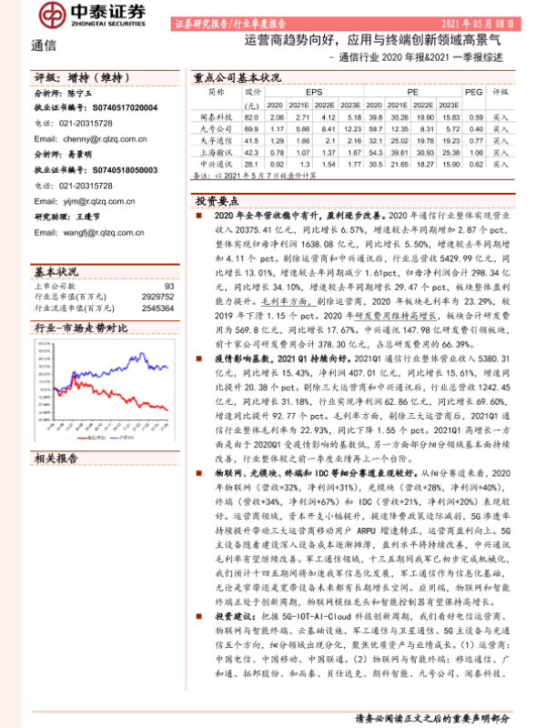 【中泰证券】【20210508】通信行业2020年报&2021一季报综述:运营商趋势向好,应用与终端创新领域高景气-42页