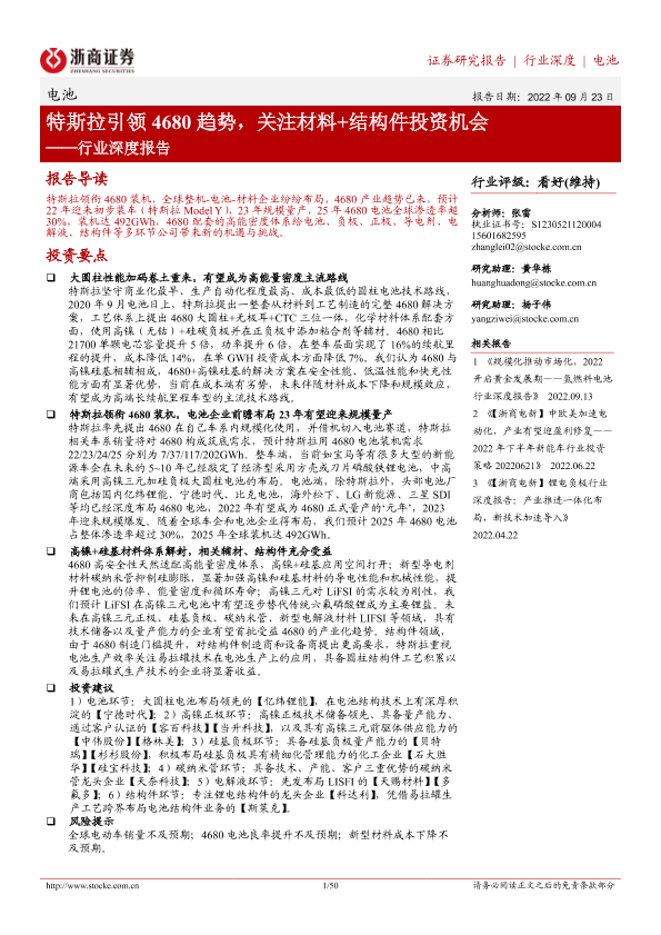 【浙商证券】【20220923】电池行业深度报告:特斯拉引领4680趋势,关注材料+结构件投资机会-50页