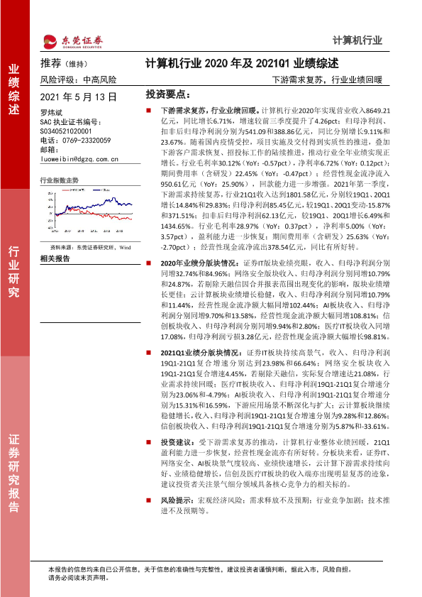 【东莞证券】【20210513】计算机行业2020年及2021Q1业绩综述:下游需求复苏,行业业绩回暖-36页