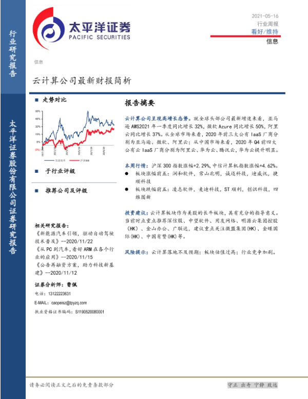 【太平洋证券】【20210516】信息行业周报:云计算公司最新财报简析-15页