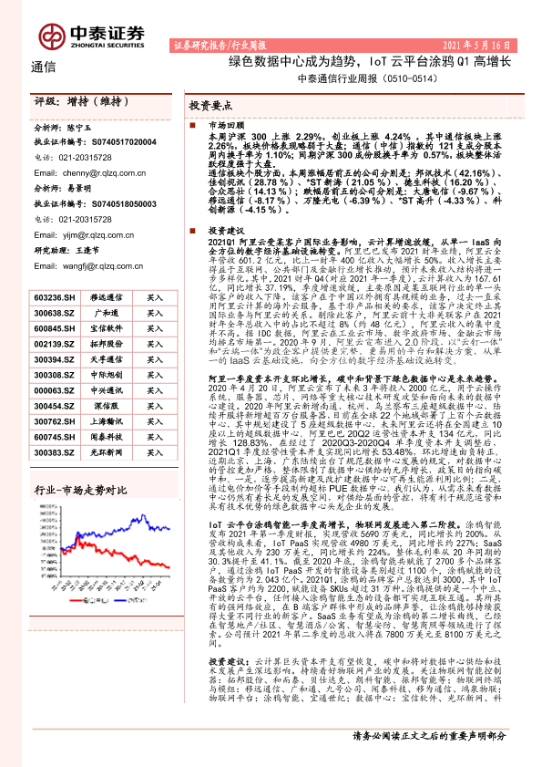 【中泰证券】【20210516】中泰通信行业周报:绿色数据中心成为趋势,IoT云平台涂鸦Q1高增长-18页