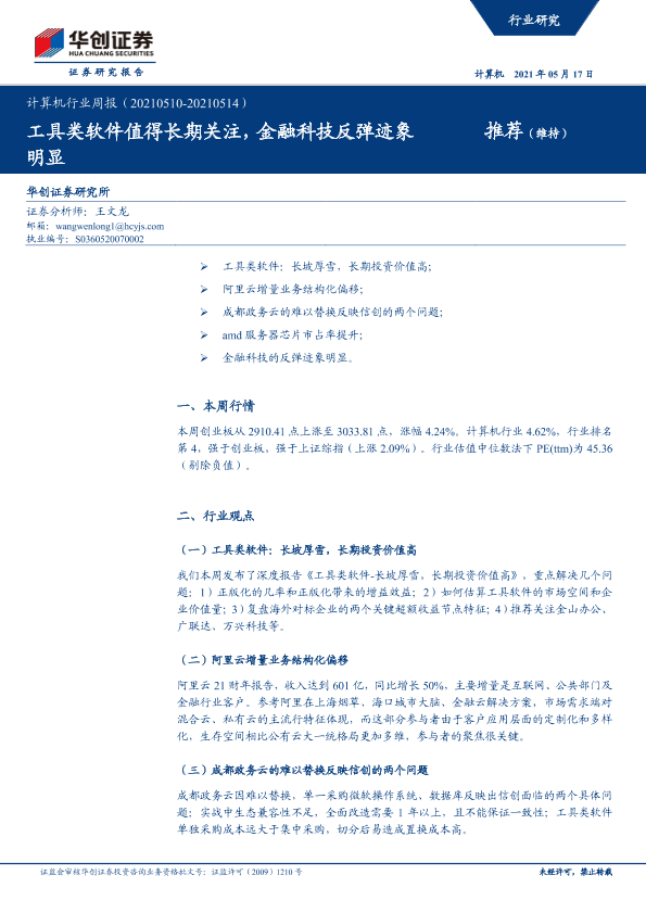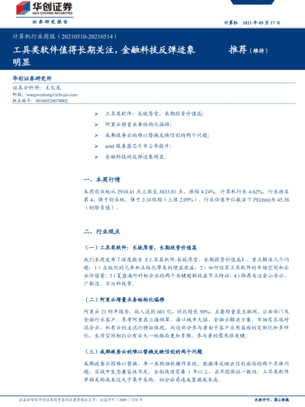 【华创证券】【20210517】计算机行业周报:工具类软件值得长期关注,金融科技反弹迹象明显-5页