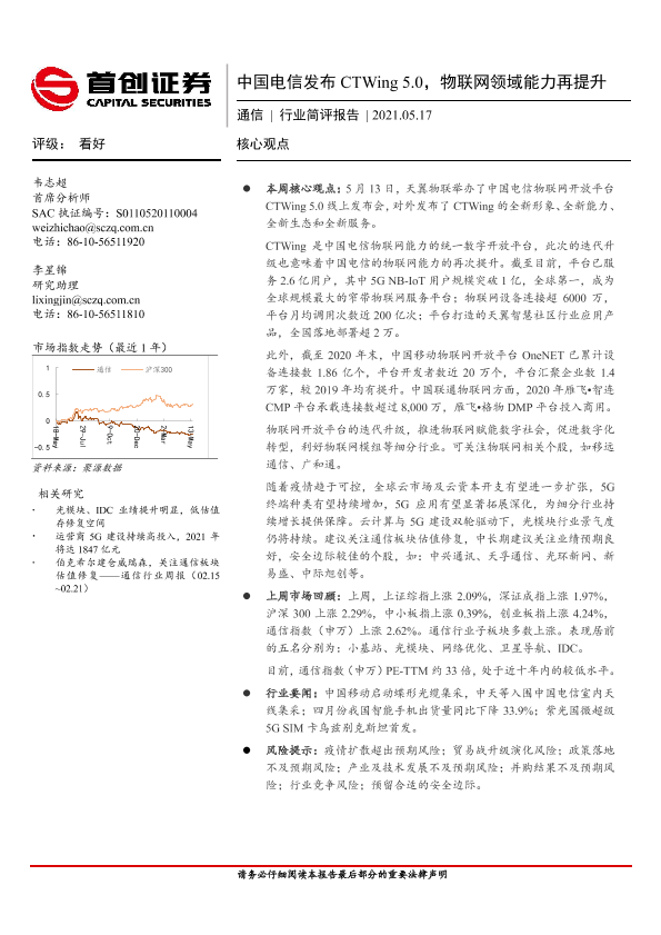 【首创证券】【20210517】20210517-首创证券-通信行业简评报告:中国电信发布CTWing 5.0,物联网领域能力再提升-9页