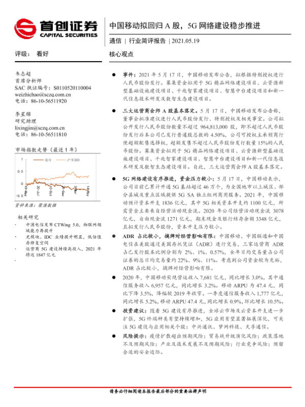【首创证券】【20210519】20210519-首创证券-通信行业:中国移动拟回归A股,5G网络建设稳步推进-3页